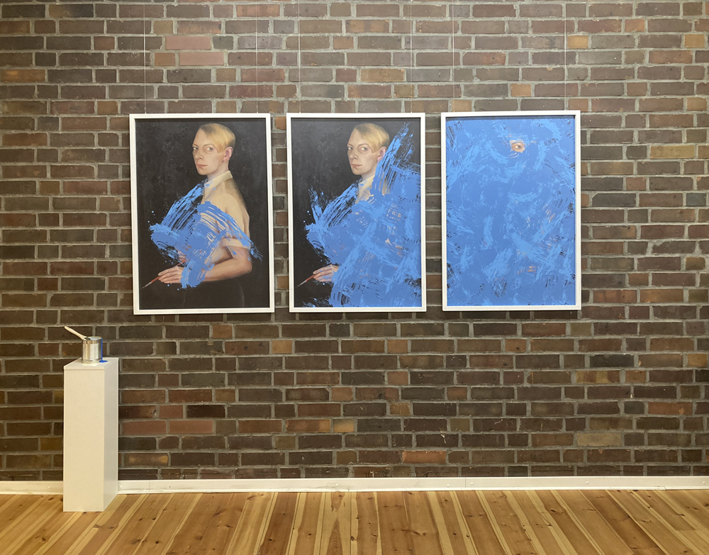Prozess - Blau ist das alte Braun?, Digitalcollagen, je 100 x 70 cm, Farbtopfdummy mit blauer Farbe und Pinsel auf Podest, 2025