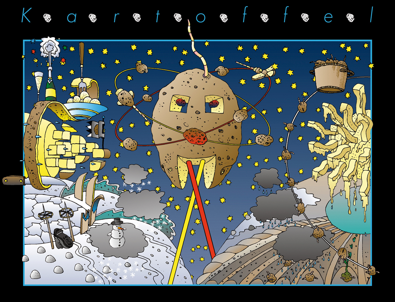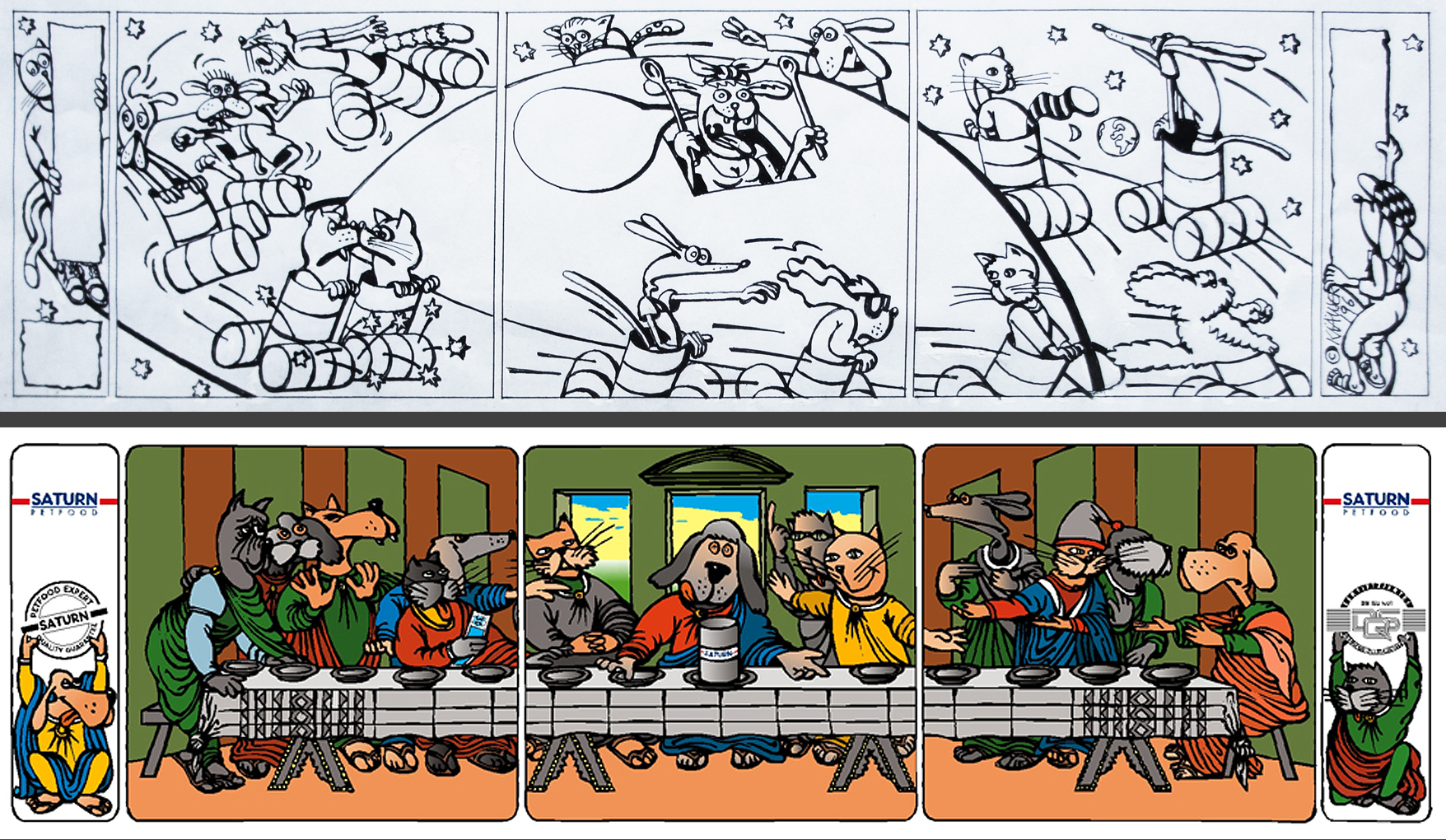 Zettelkastenillustrationen (Saturnringe und Abendmahl) für einen Petfoodhersteller, Feder, Tusche, digital koloriert, 1996