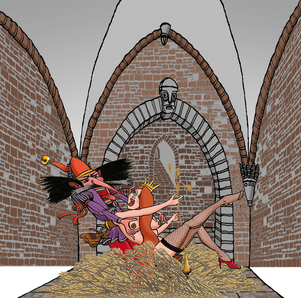 Dioramaillustrationsteile (Rumpelstilzchen), Graphit, digital koloriert, ausgeschnitten und hintereinander montiert, 2018