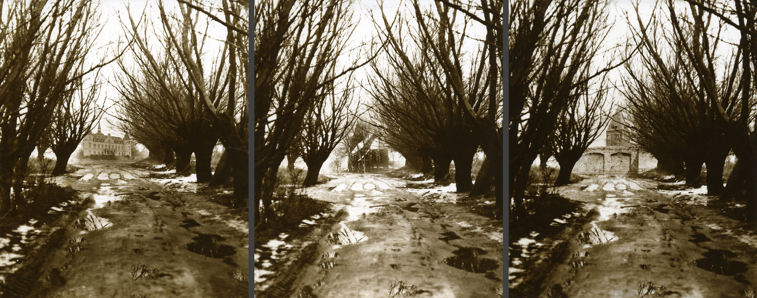 Hohlweg Gollwitz/Insel Poel und Schloß Ralswiek, Jakobikirche Greifswald und Stadtmauer Greifswald, Fotomontagen mit jeweils zwei s/w-Negativen, anschl. Brauntonung der Papierabzüge mit rotem Blutlaugensalz,
